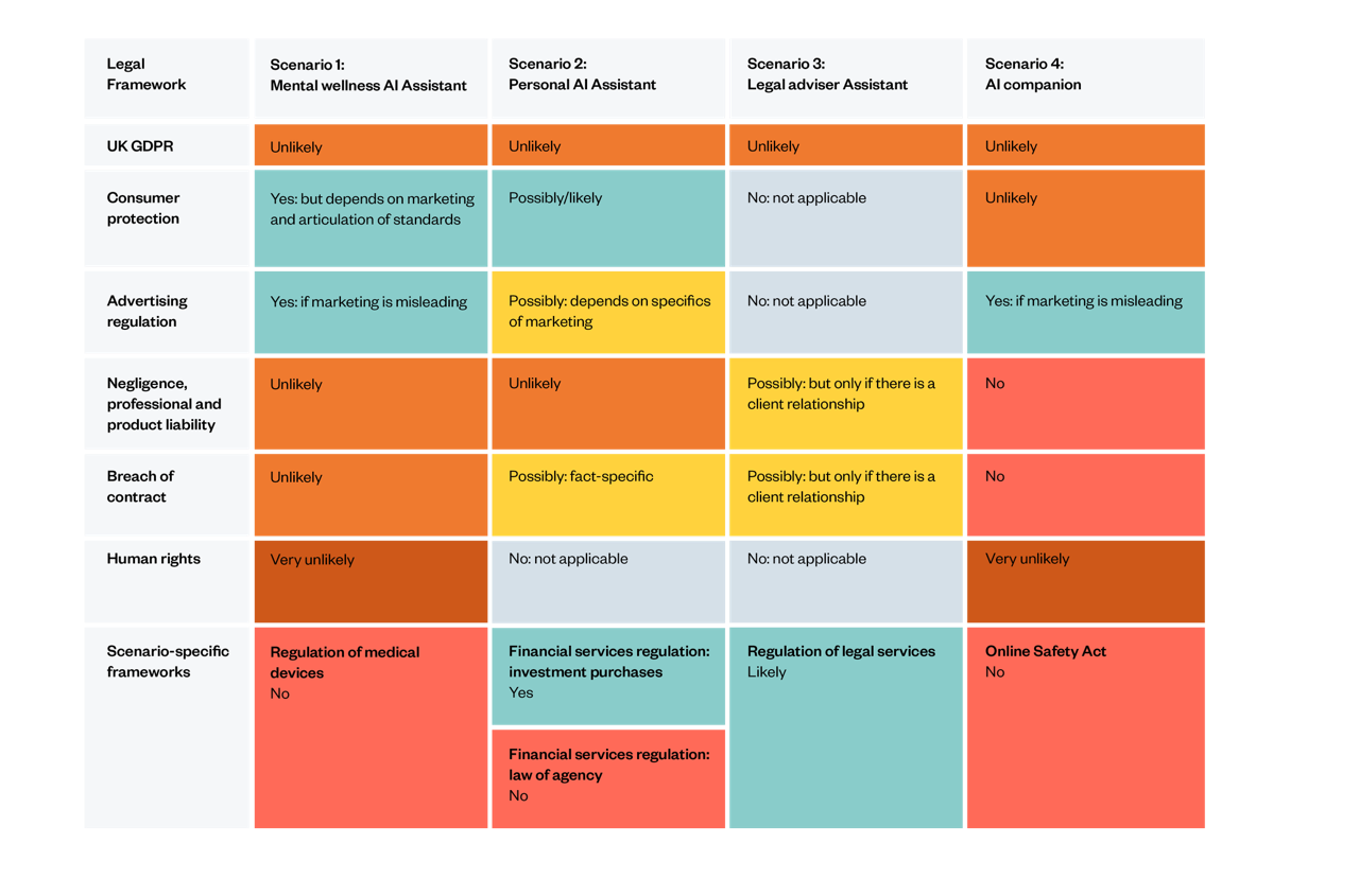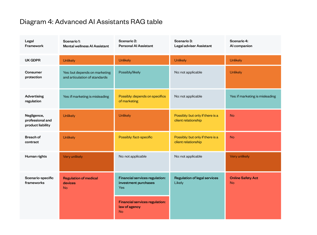 The scenarios explored in this legal analysis present a sombre picture. Most of the harms considered are not well covered by pre-existing law and regulation in England and Wales. Where some legal coverage does exist, it is an awkward fit with real-world protection, clouded by uncertainty. This issue requires urgent attention from policymakers, considering the speed at which Assistants might be adopted across society and the range of harms they can cause.